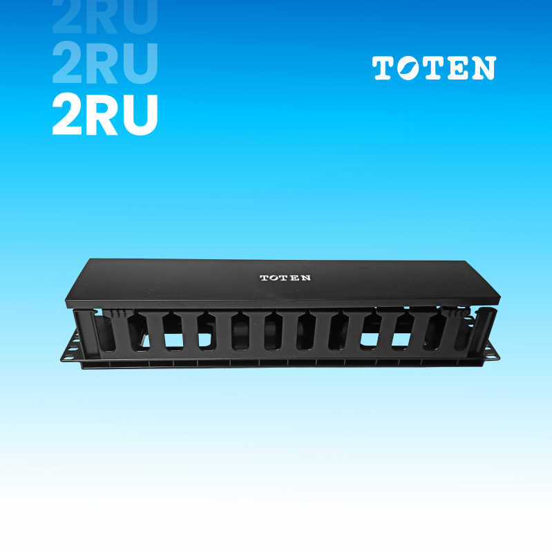 Accesorio horizontal de 2RU para una gestión organizada de cables en gabinetes de 19”. Cuenta con tapa desmontable y un diseño en material plástico liviano de alta densidad (HD), ideal para facilitar el mantenimiento y conservar el orden interno del rack.