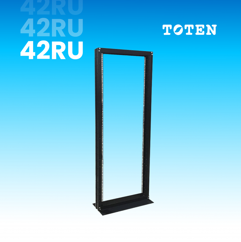 Rack abierto de piso Toten de 42 RU modelo CR.5242.9001. Diseñado para instalaciones estándar de 19”, es una estructura robusta y confiable con capacidad de carga estática de hasta 200 kg. Su fabricación en acero y acabado con pintura en polvo lo convierten en una solución duradera para equipos de red.